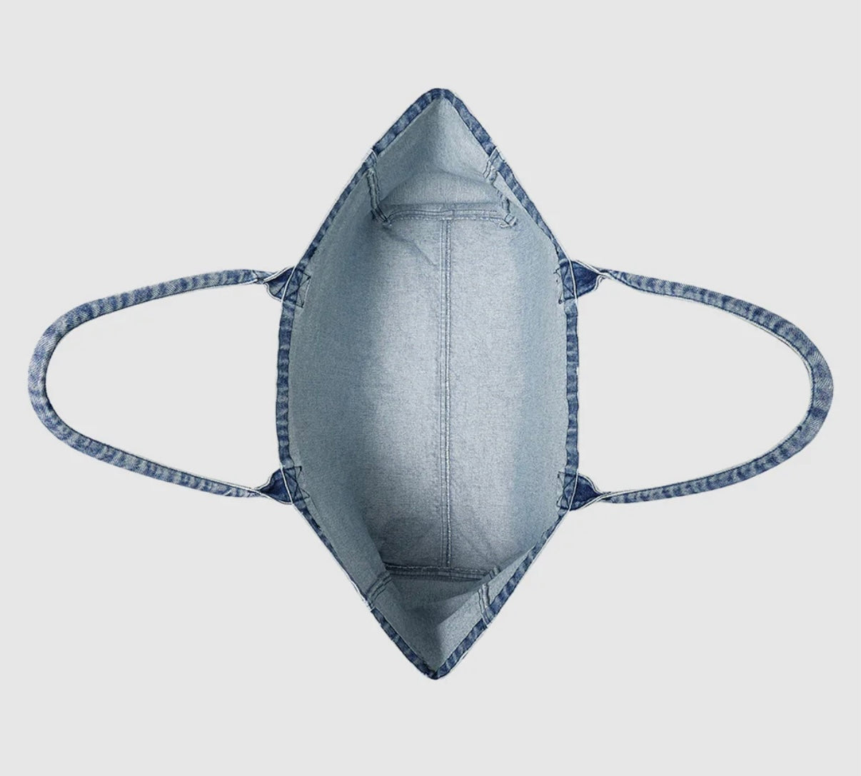 An unlined canvas tote bag featuring all-over denim and ANINE BING branding in contrast white.