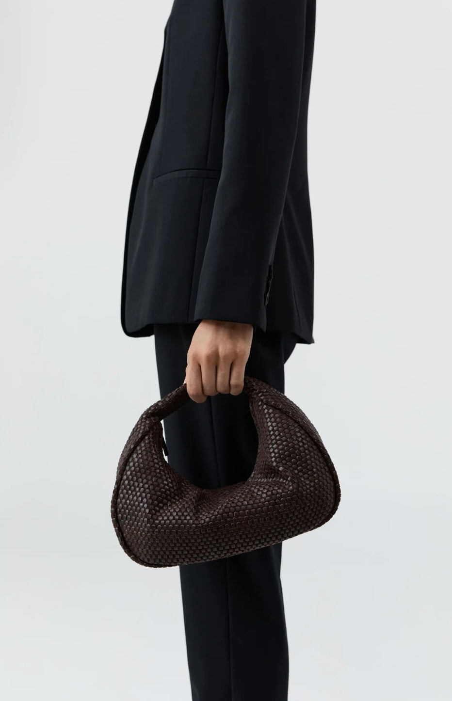 An elevated accessory, the Lattice Weave Bon Bon Bag features an intricately woven body, structured top handle, and a sleek clutch silhouette. Both refined and versatile, it adds subtle texture and makes an ideal accompaniment to any minimalist ensemble.