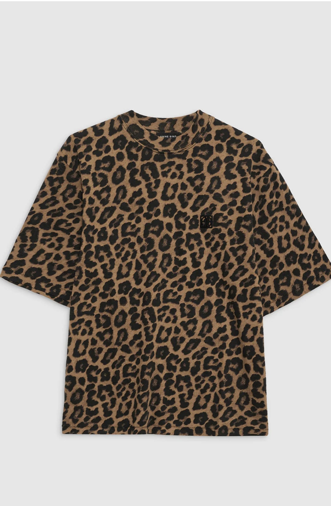 The Avi Tee is an oversized, boxy T-shirt constructed from lightweight 100% cotton jersey in an all-over black and brown leopard print.