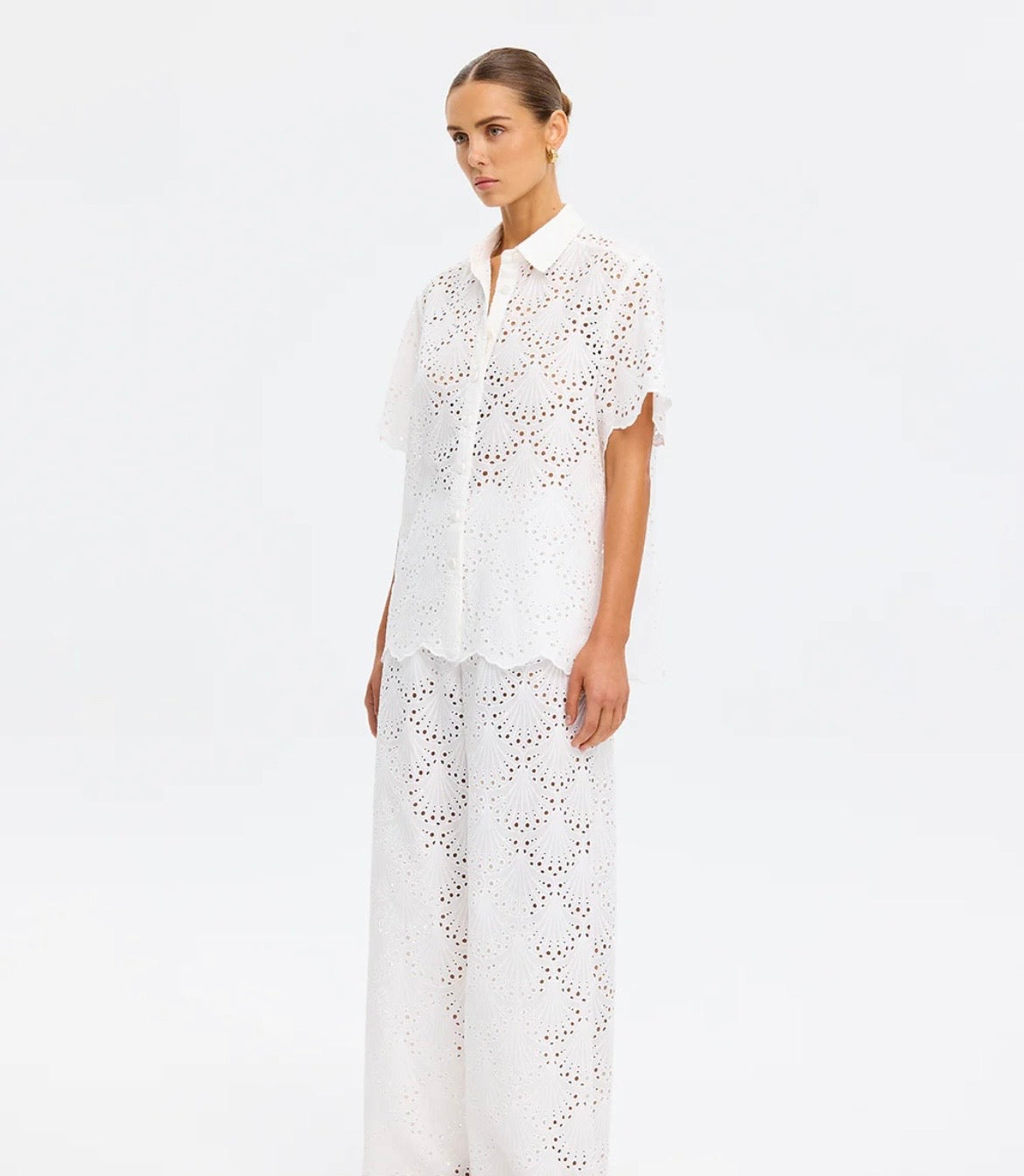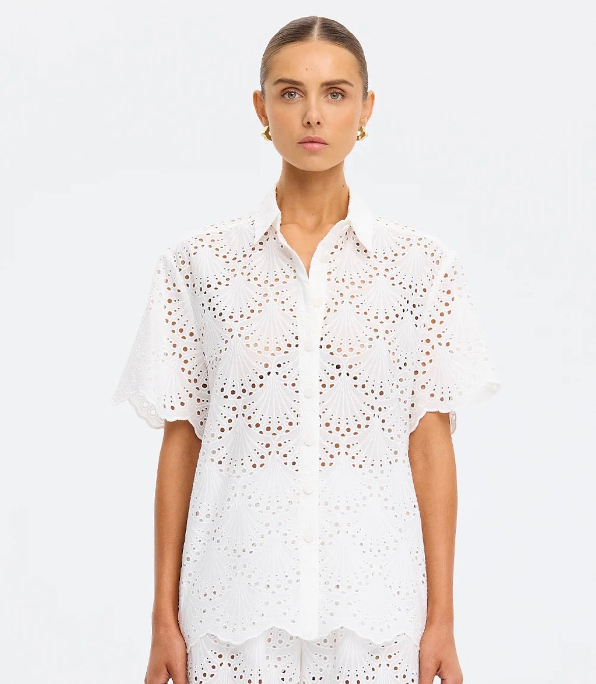 The Elodie Top is crafted in a shell design broderie in a relaxed fit, featuring a front button opening with signature buttons, short sleeves complete with scallop edging on the cuffs and hem. Light and easy to wear, it brings a refined softness to warm-weather dressing