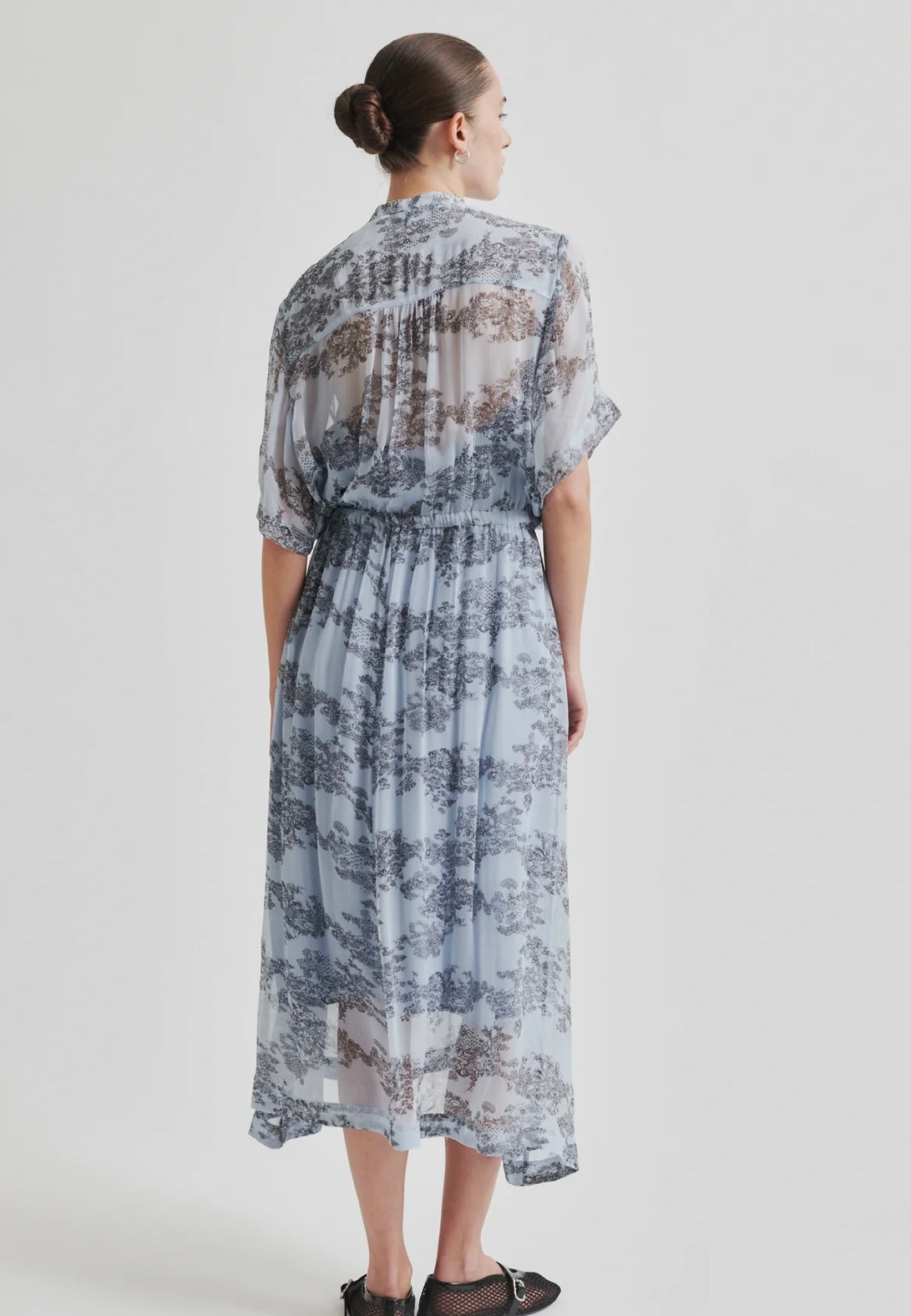 Second Female short-sleeved dress. The dress is made in light, semi-sheer viscose with all-over pattern. Detachable and adjustable underslip. Featuring a half placket with button fastening and drawstring with ties at both sides of the waist. Loose fit that can be pulled in with the ties for a more defined silhouette.