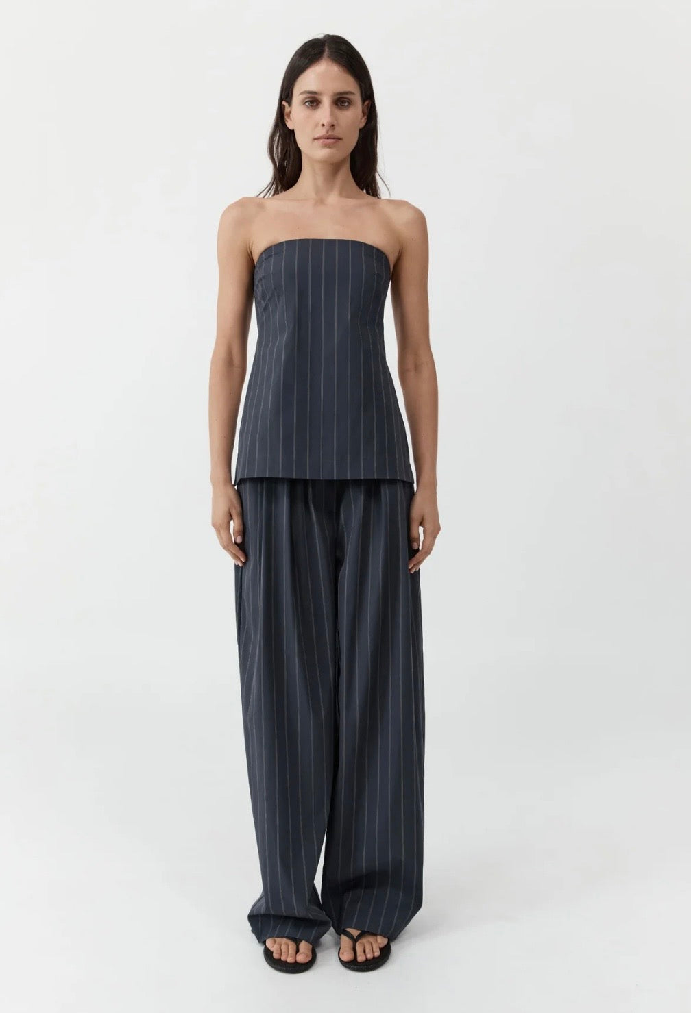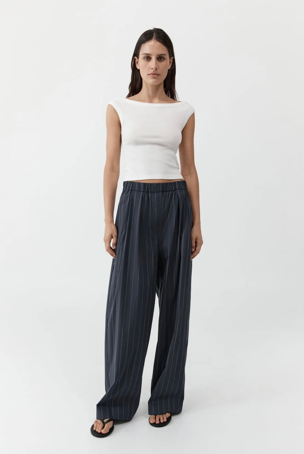 The Stripe Relaxed Pleat Pants are designed with ease, cut with a mid-rise waist and a gently tapered leg. Box pleats and a waist yoke add subtle shape, while side seam pockets provide everyday functionality. The Stripe Relaxed Pleat Pants offer an understated approach to everyday dressing
