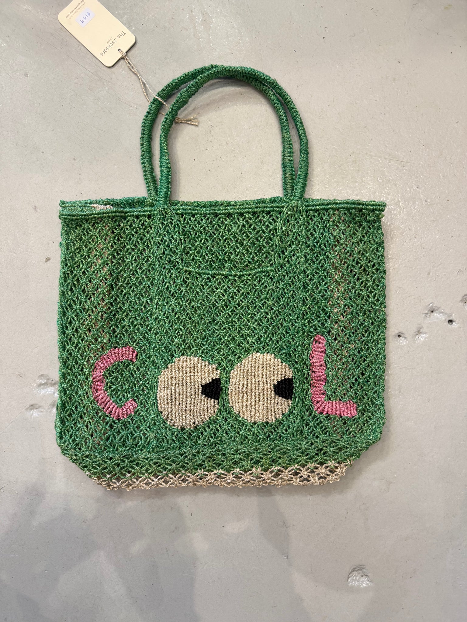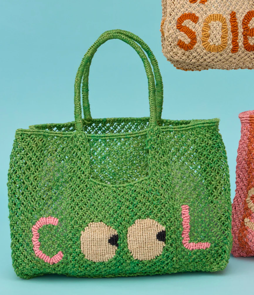 Woven Tote Bag in Green with Embroidered Eyes . A fun pop of colour for the beach and your day out .