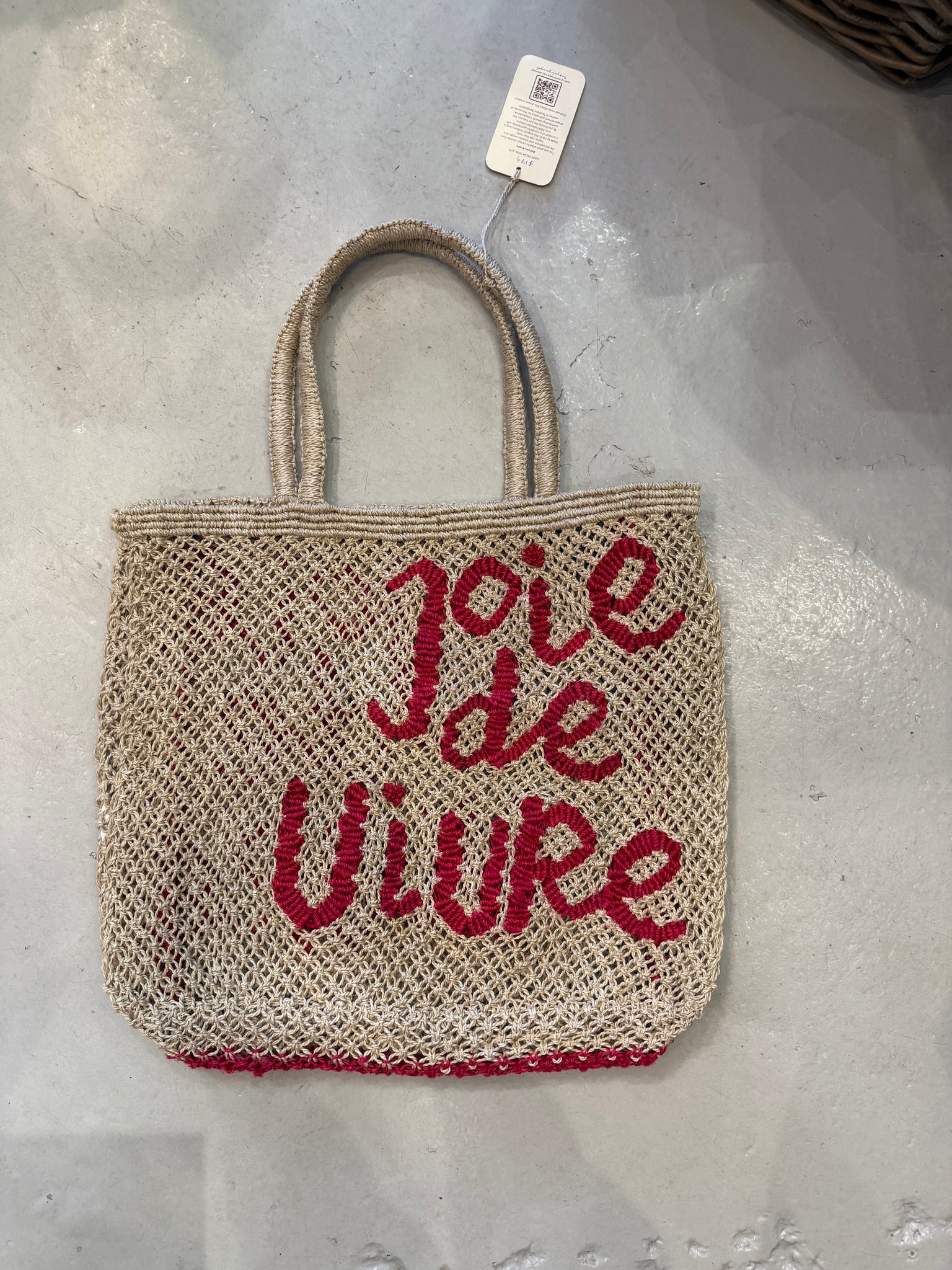 The large Jacksons Tote in Natural with vibrant red script celebrating the Joy of Life