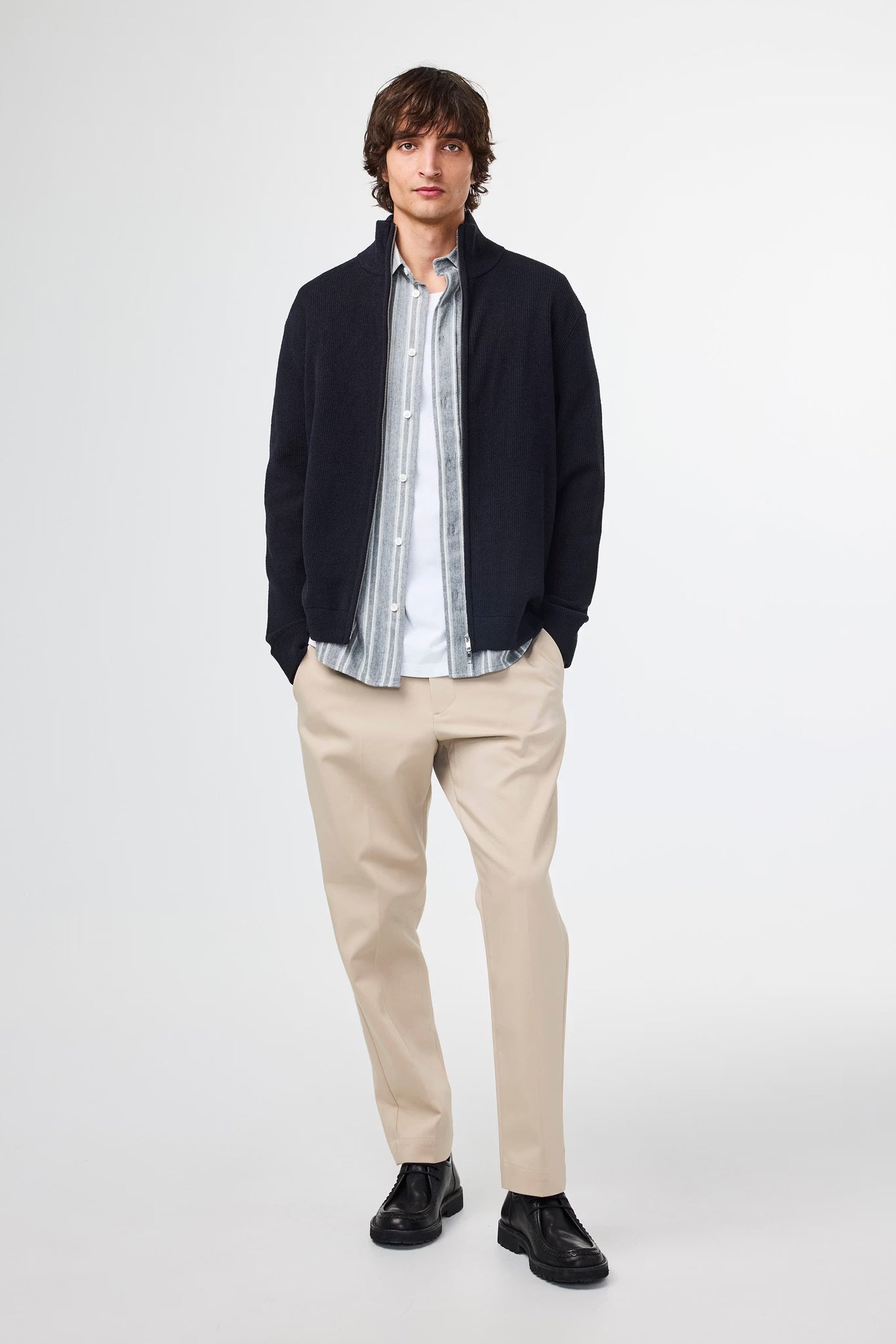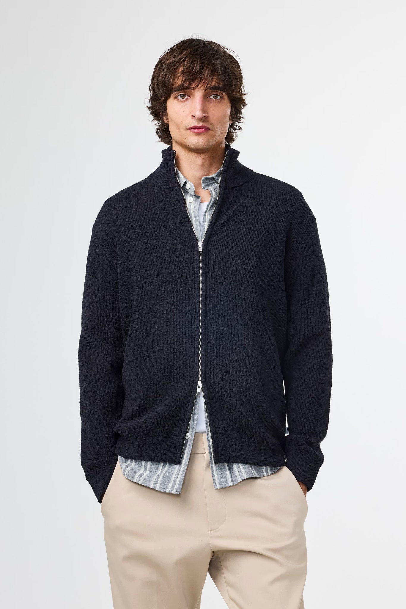 Classic ultra-soft full-zip knit made from a polyester rib knit stitch.
