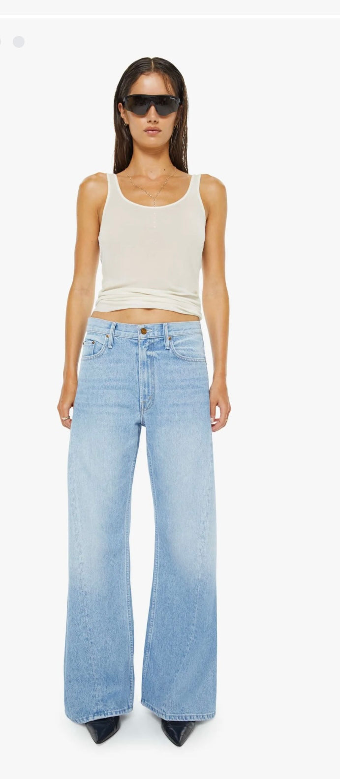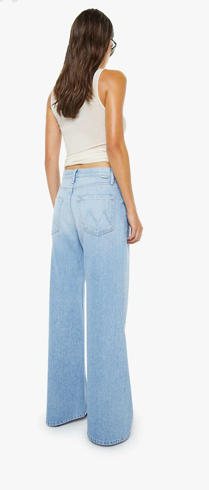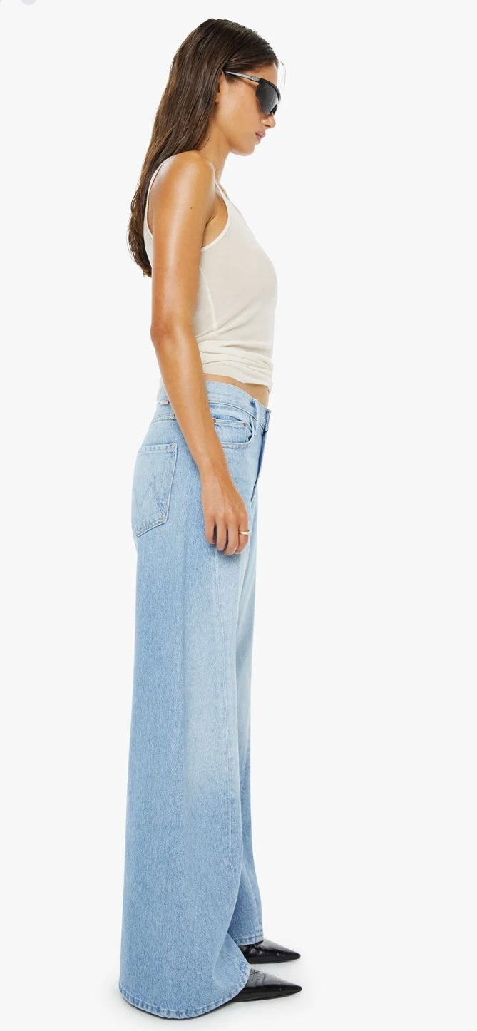Wide leg jeans from SNACKS!, a collection of unconstrained silhouettes leaning into exaggerated shapes and extreme proportions. Experimental and non-era specific. For everyone, or not. Designed to sit on the hips with a slouchy fit, these high rise jeans have a zip fly, loose wide leg with a curved outer seam and a 31-inch inseam with a clean hem. Made from a rigid recycled cotton blend, Munchies is a light blue with subtle whiskering, fading at the knees, a pretzel-detailed button and candy-inspired interior rivets. Would you like a treat?