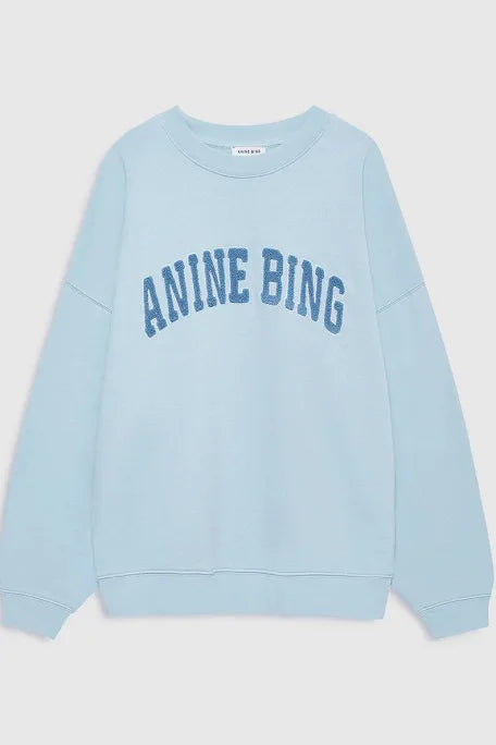 An oversized crewneck pullover made from midweight 100% cotton fleece in pale blue that's brushed on the inside.