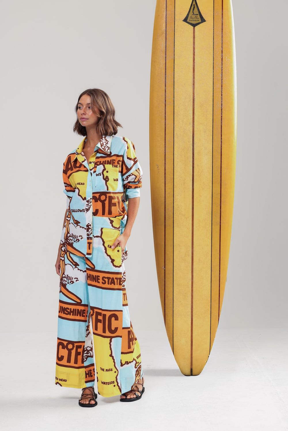 FOLK is the kind of pant you pack first every holiday YIYO. Bold vintage-inspired print, comfy elastic back, and sunny yellow quilt stitching to sweeten the deal. Wide leg, side pockets, and all the road trip energy. Its really good fun, cute & a bit cool just like you on holidays when not dealing the barrage of endless demands of your usual Mon - Fri. Pop the collar & the prosecco. Just add matching COMBI shirt for a set & forget. Out of Office (eternally on.)