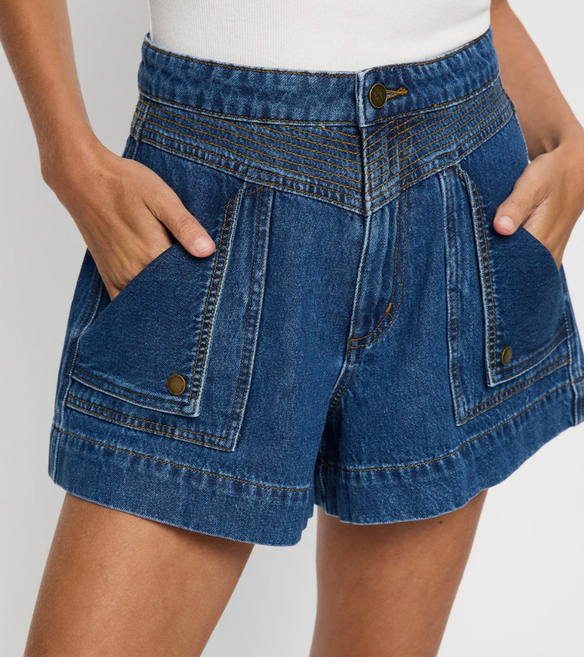 A modern essential, our signature Celene Short in indigo features contrast topstitching and panel detailing, front fold over pockets, complete with antique brass logo hardware.