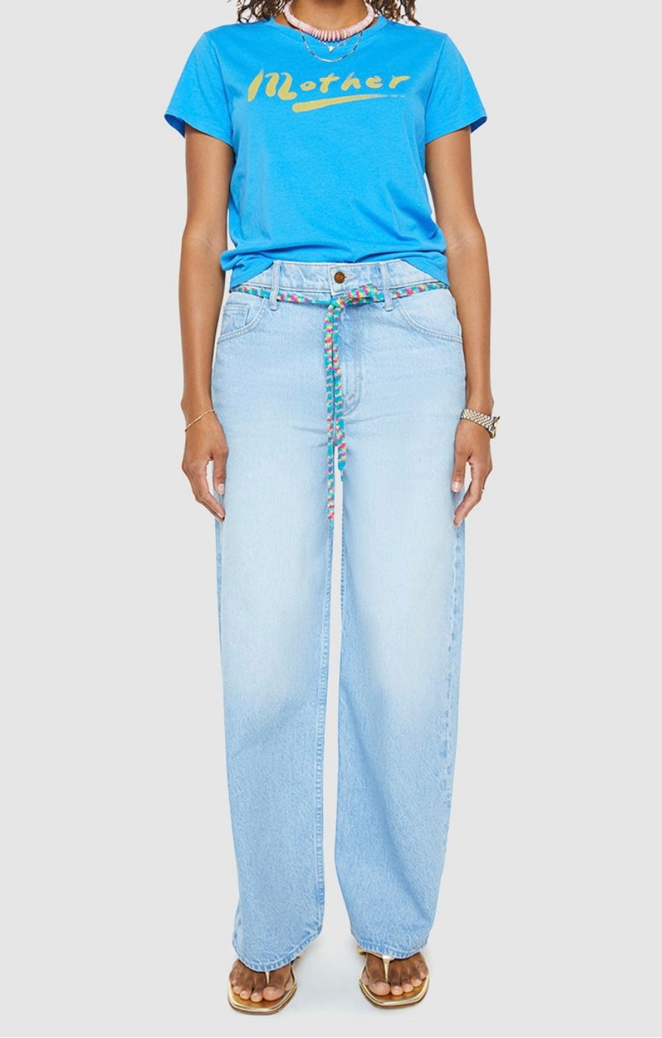 The Lil Goodie Goodie Top by MOTHER, featuring a classic crew neck and short sleeves in a soft, lightweight fabric. Tuck it into high-waisted jeans and add slides for an easy, everyday style.