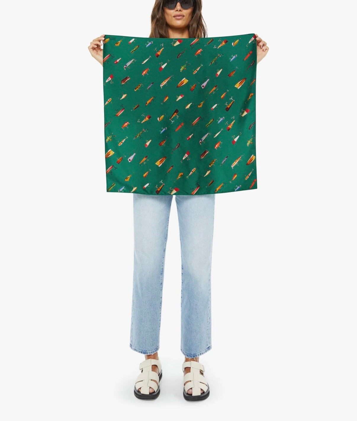 Hooked. A 25-inch-wide square scarf designed to be worn around the neck, on your head or tied on a bag. Made from 100% silk, Fishing On All Sides is a semi-sheer green-teal with a colorful fishing lure print.