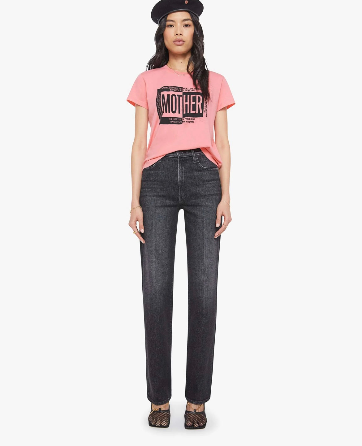 Now showing. A soft crewneck with a slim fit for a vintage look and feel. Made from 100% supima cotton in light pink, the tee features a ticket-inspired graphic and MOTHER's name in black on the front.