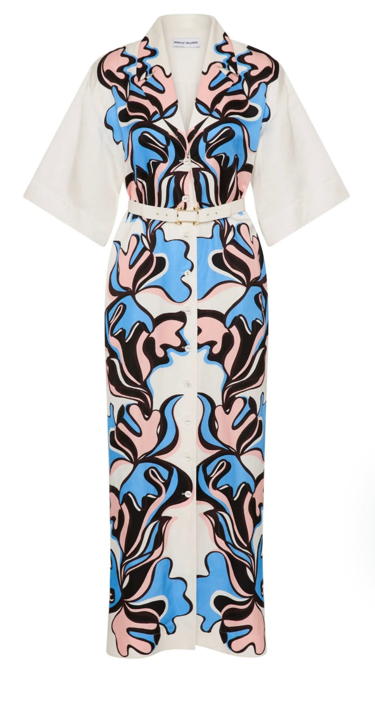 The Barbados Breeze Midi Dress infuses contemporary style with a playful custom print. Tailored in a shirt dress silhouette, it features wide sleeves and a sleek collared neckline that radiate sophistication, while front and back yoke detailing add a polished touch. Side splits at the hem elevate the chic midi skirt, and a PU belt with a gold buckle cinches the waist to enhance the flattering fit. Finished with side seam pockets, this versatile dress effortlessly combines comfort and elegance.