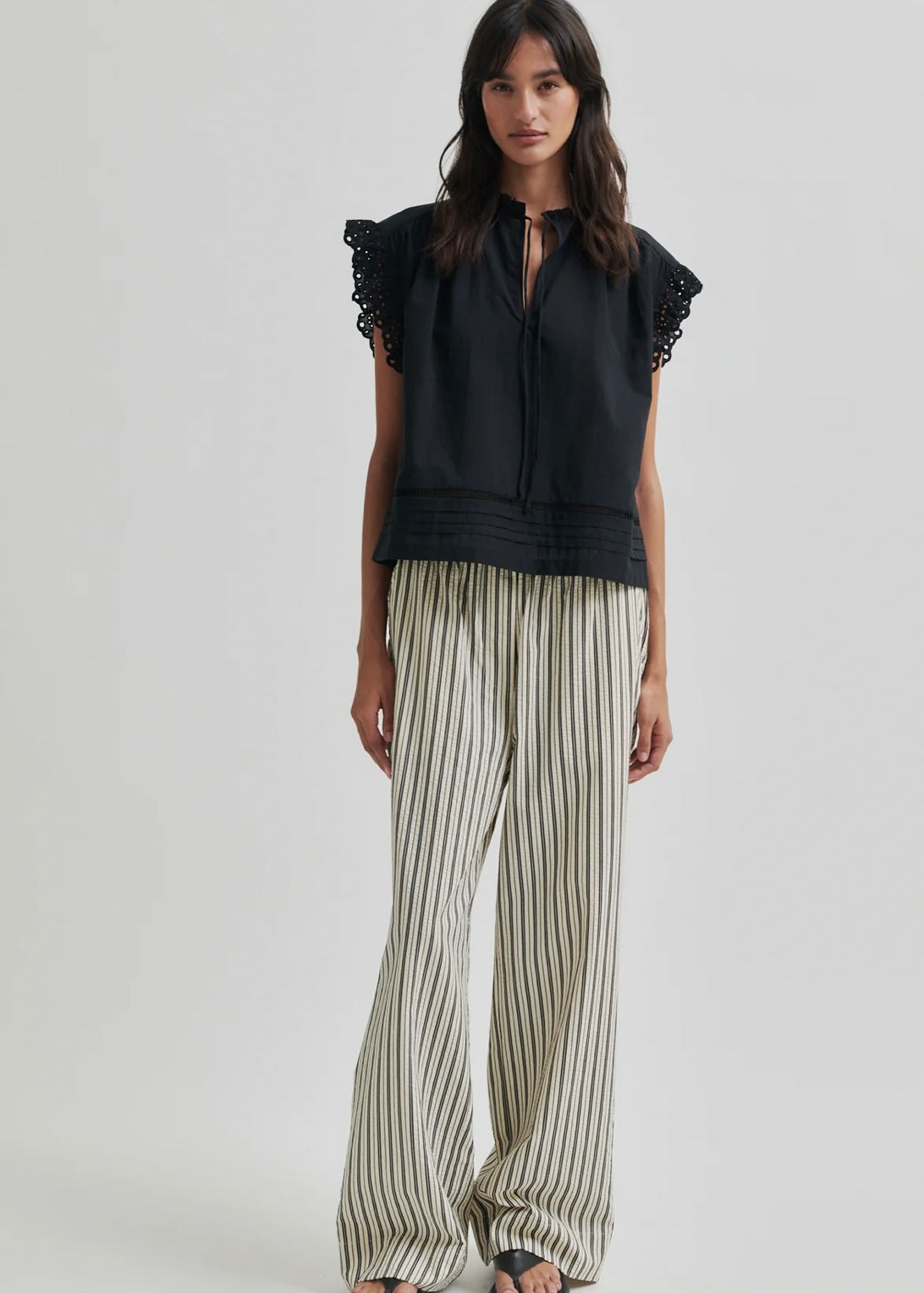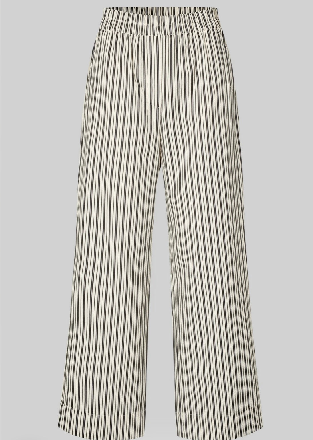 Second Female striped trousers. The trousers are made in a cotton blend with slight seersucker structure. Featuring a covered elasticated waistband and decorative fly at the front. Two slanted pockets at the front and two decorative pockets at the back. Regular waist with straight, wide leg.