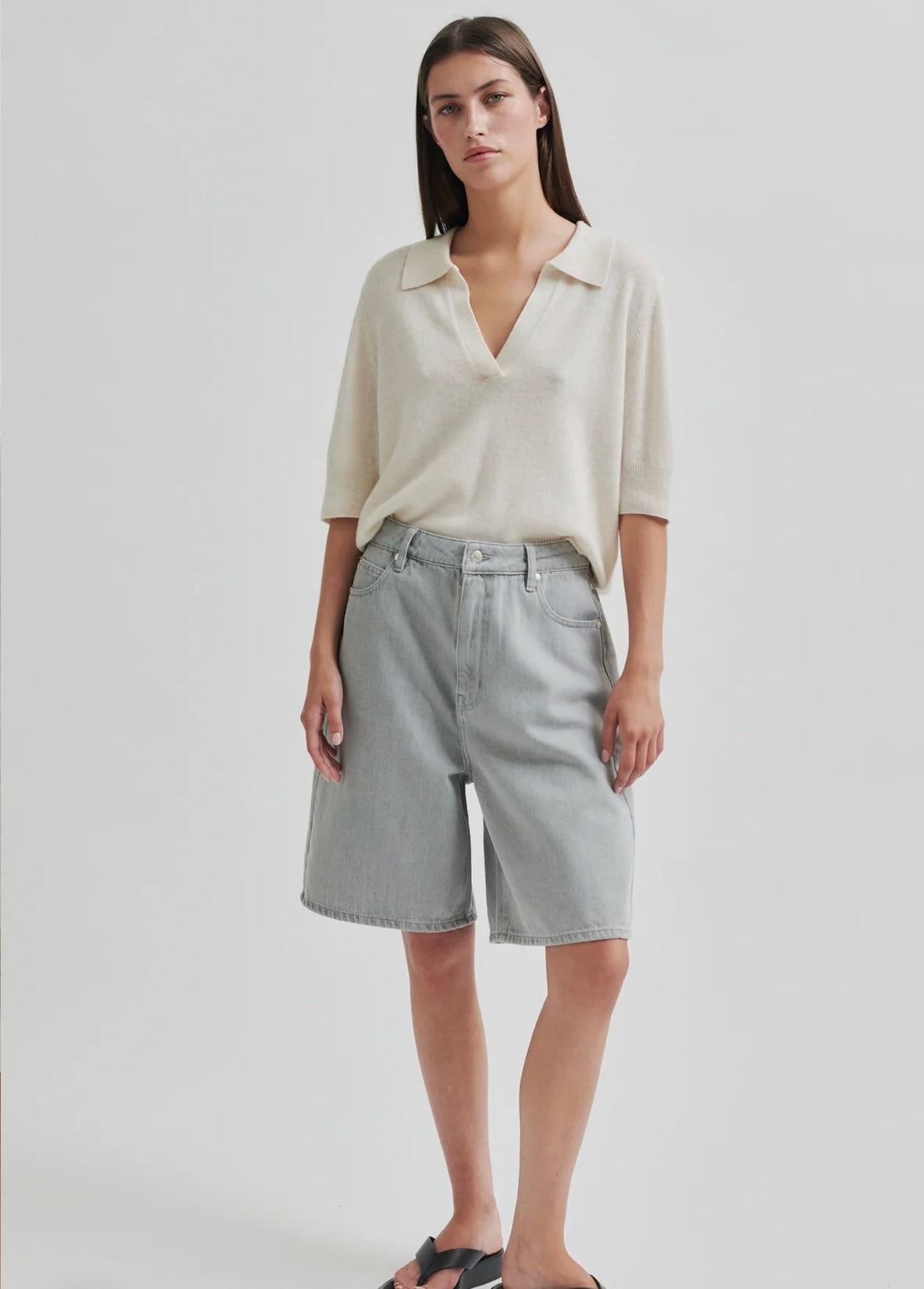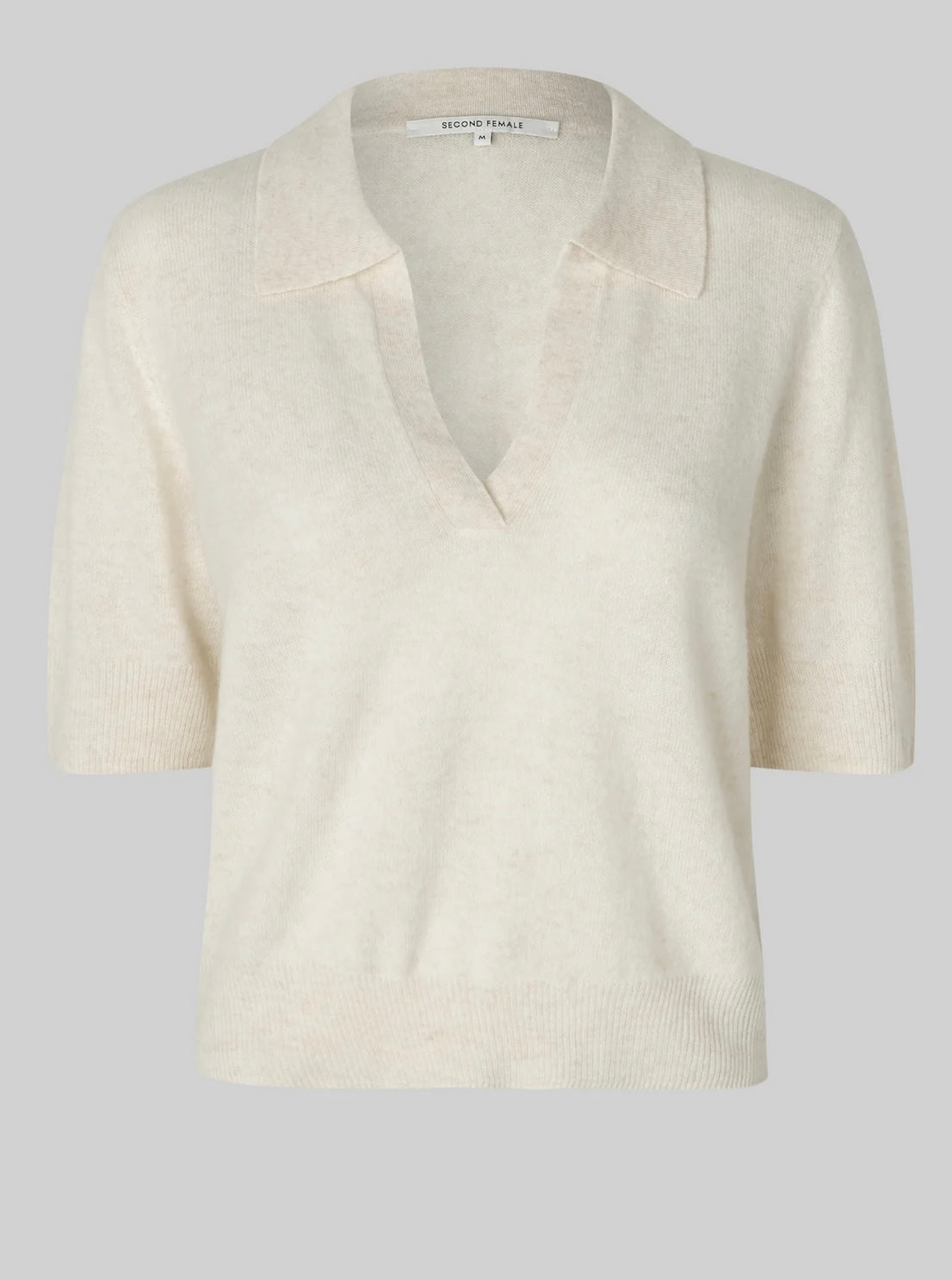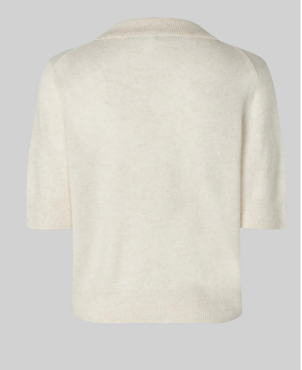 Second Female short-sleeved knit. The knit is made in an ultra-soft wool-cashmere blend. Featuring a polo collar with open neck. Slightly dropped shoulders with short sleeves. Ribbed collar, sleeve ends and bottom hem. Regular fit with relaxed silhouette